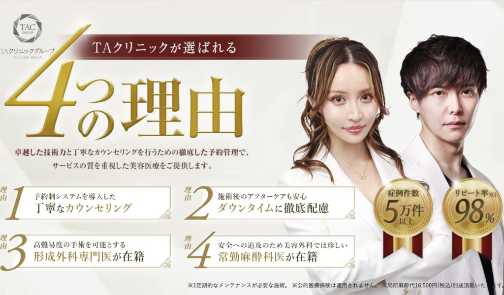 TAクリニックは、「自然で美しい仕上がり」に徹底的にこだわる美容クリニックとして、多くの女性から高い支持を得ています。特に二重整形では、患者一人ひとりの目元の形や骨格、まぶたの厚みまで細かく分析し、最適なデザインを提案してくれる点が大きな強みです。