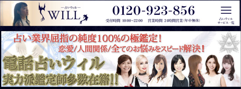 電話占いウィルは、メディア露出の多い人気占い師が多数在籍している実績豊富なサービスです。恋愛相談にも強く、特に復縁や不倫といった複雑な恋愛に関する相談で高い評価を得ています。