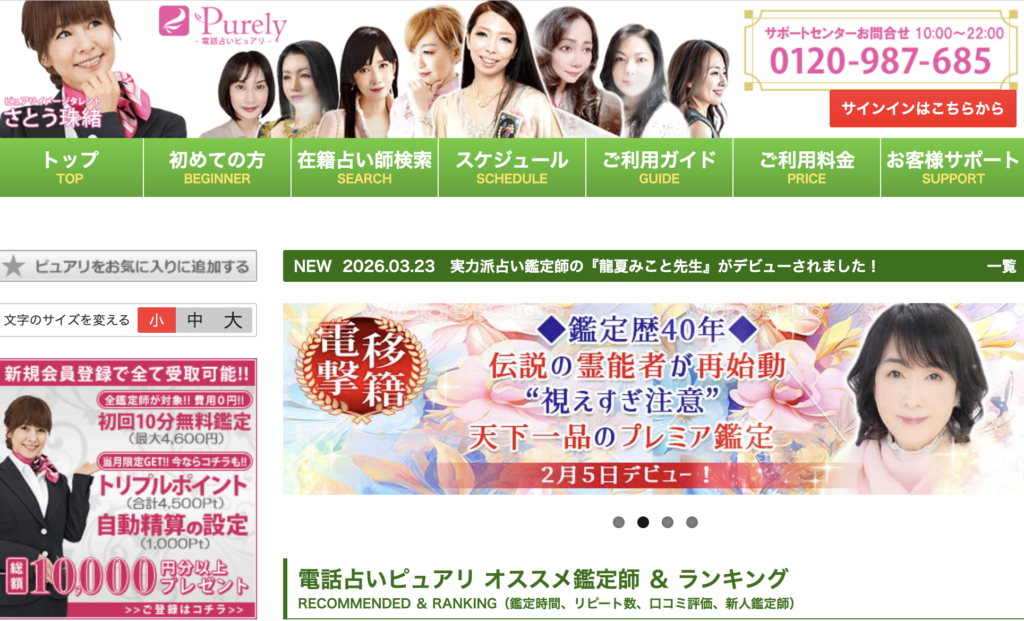 電話占いピュアリは、長年の運営実績と豊富な在籍占い師数を誇る大手サービスです。恋愛相談にも強く、特に初めて電話占いを利用する方に人気があります。